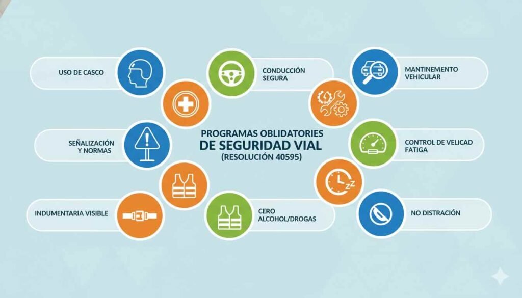La Resolución 40595, en su Anexo 1 (Metodología para el diseño, implementación y verificación), es explícita al detallar los programas mínimos que toda organización, sin importar su nivel (Básico, Estándar o Avanzado), debe implementar. Estos programas son la columna vertebral de tu gestión de riesgos viales.